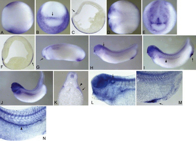 Fig. 2. Expression of Xsl-1 RNA. All embryos are pictured with the anterior to the left unless otherwise noted (B,E,K). Stages 12 (A–C) and 17 (D–E) are shown from dorsal views (A,D), frontal views (B,E), where dorsal is to the top of the frame, and as saggital sections (C,F). Stages 24 (G), 28 (H), 33 (I,L,M), and 37 (J,N) are shown as lateral views. Panel K is a transverse section of a stage 37 embryo at approximately the level of fourth trunk somite. High magnification views of a cleared stage 33 embryo are pictured in L (anterior) and M (posterior). A high magnification view of expression in the pronephros, somites, and neural tube of a cleared stage 37 embryo is seen in N. Further description of the arrows and arrowheads can be found in Section 1.