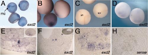 Figure 6. Expression and germ plasm localization of exd2. In situ hybridization against exd2. A: High magnification view of stage I oocytes; mc, mitochondrial cloud. B: Stage IV (left) and stage VI (right) oocytes, vegetal views. C: Four-cell embryos, vegetal view. D: Stage 18, showing lack of expression. E: Stage 7 sagittal section. F: Stage 11 sagittal section. Insets show low power views in E, F. G: Section of adult testis, exd2 antisense probe. H: Sense control on testis. Image published in: Cuykendall TN and Houston DW (2010) Copyright © 2010. Image reproduced with permission of the Publisher, John Wiley & Sons.