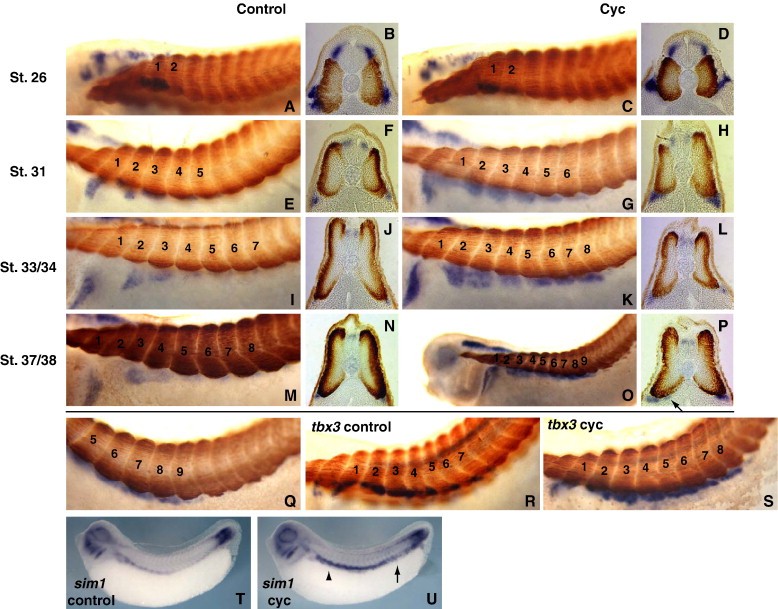 Fig. 5. Cyclopamine treatment expands hypaxial specific markers medially and posteriorly. The expressions of lbx1 (AâQ), tbx3 (R, S), and sim1 (T, U) were examined in control (A, B, E, F, I, J, M, N, R, T) and cyclopamine-treated (C, D, G, H, K, L, O, P, Q, S, U) embryos. Trunk somites in lbx1- and tbx3-probed embryos are labeled with numbers, with the most anterior trunk somite labeled 1. At stage 26 there are no significant differences in lbx1 expression between control (A, B) and cyclopamine-treated embryos (C, D). At stages 31 (EâH), 33/34 (IâL), and 37/38 (MâQ), lbx1 expression is expanded one somite posterior compared to controls, and is expanded medially towards the notochord (P, arrow, compare to N). The image in panel Q is a higher power image of the embryo in panel O. The expression of tbx3 is also expanded one somite posteriorly in cyclopamine-treated embryos (S compared to R). The expansion of the hypaxial dermomyotome marker sim1 is also observed in stage 32 cyclopamine-treated embryos (U) in both the anterior somites where it is normally expressed (arrowhead) and in the posterior somites (arrow), as compared to a control embryo (T). Image published in: Martin BL et al. (2007) Copyright © 2007. Image reproduced with permission of the Publisher, Elsevier B. V.