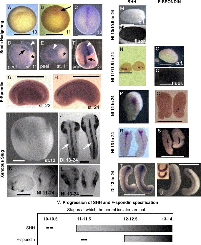 Fig. 3. Timing and pattern of the expression of Sonic Hedgehog, F-spondin and Xslug are shown by in situ hybridizations organized by type of preparation and by stage of development at fixation, in the case of embryos or peeled embryos (stage indicated at the lower right corner), or embryonic stage at which the preparations were made, in the case of explants (stage is indicated at the left or lower right corner); all explants shown were cultured to stages 24–27 and fixed for in situ hybridization. These data are discussed in the text. Panels D and E respectively show a sagittal and dorsal view of a whole embryo with a partially peeled neural plate. Anterior or dorsal is at the top in all images (NI: neural isolate; DI: dorsal isolate). The schematic below (V) qualitatively indicates that the percentage of neural isolate explants that contain cells specified to express SHH or F-spondin rises as the neural explants are cut later. By stage early neurula stages 13–14, all neural isolates express SHH or F-spondin at the midline. The minus signs indicate that neural explants are not yet specified to express a gene at a particular stage.
