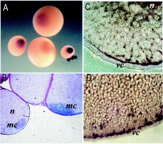 Fig. 3. Localization of Germes mRNA during oogenesis analyzed by in situ hybridization. (A) Whole-mount of stages IâVI oocytes, vegetal view. In the smallest oocytes (stage II), the entire cytoplasm is heavily stained. (B) Epon section through stage II oocytes reveals concentration of Germes message in mitochondrial cloud. Oocyte on the right illustrates the commencement of the accumulation of the message in the vegetal cortex. (C) In situ hybridization for Germes on paraffin sections of stage III oocyte. The mRNA anchors on the vegetal cortex, forming the continuous layer. (D) In situ hybridization on paraffin sections of stage VI oocytes. The Germes transcript forms a granular pattern within the vegetal cortex. mc, mitochondrial cloud; n, nucleus; vc, vegetal cortex. Image published in: Berekelya LA et al. (2003) Copyright © 2003. Image reproduced with permission of the Publisher, Elsevier B. V.