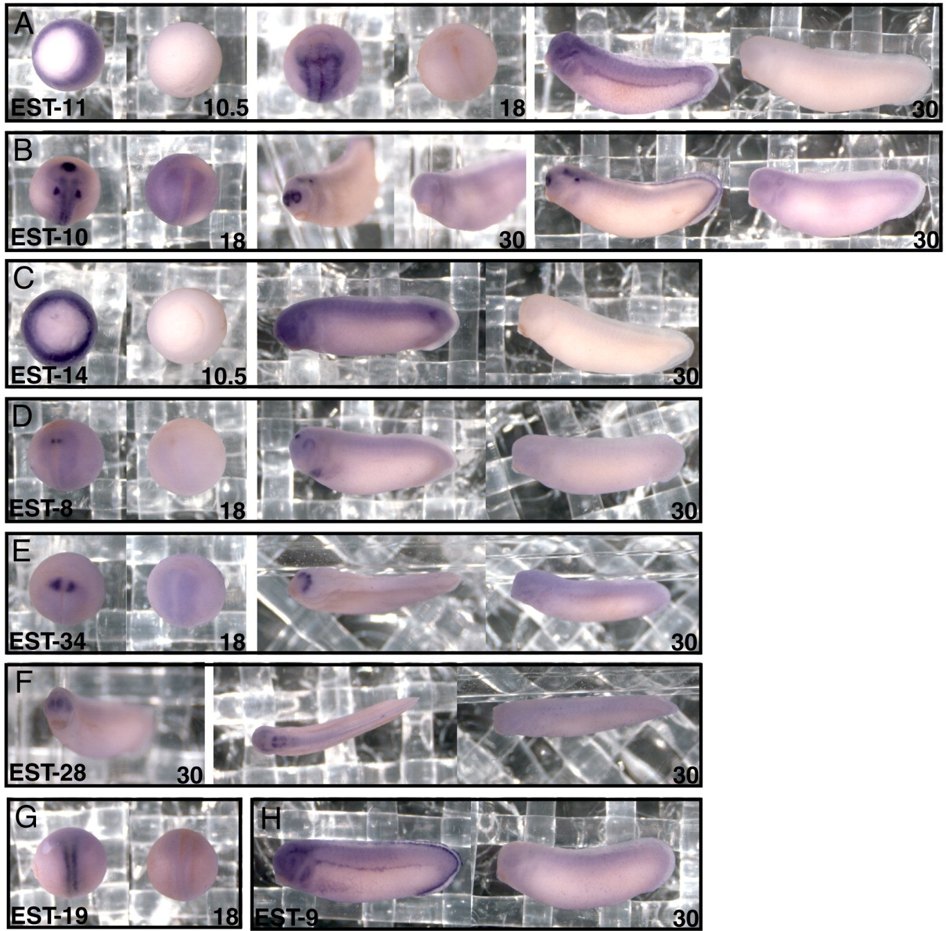 Figure 2. In situ hybridization screen reveals new expression patterns. A: Embryos at gastrula (10.5), neurula (15), and tailbud (30) stage are stained with antisense (left) and sense (right) probes for EST-11 showing expression in the mesoderm, neural tube, neural crest, and pronephros. B: Embryos at neurula and tailbud stage are stained with antisense and sense probes for EST-10 demonstrating expression in cement gland, neural tube nasal placode, otic placod, and forebrain. C: Embryos at gastrula and tailbud stage are stained for antisense and sense probes for EST-14 demonstrating expression in mesoderm and in a single posterior somite. D: Embryos at neurula and tailbud stage are stained with antisense and sense probes for EST-8, indicating expression within forebrain and heart. E: Embryos at neurula and tailbud stage are stained with antisense and sense probes for EST-34, showing expression in the placodes. F: Embryos at tailbud stage are stained with antisense and sense probes for EST-28 showing expression in nasal placodes and hindbrain. G: Embryos at neurula stage are stained with antisense and sense probes for EST-19, indicating expression within the neural tube. H: Embryos at tailbud stage are stained with antisense and sense probes for EST-9, demonstrating expression within pronephros and neural crest. Image published in: Dickinson K et al. (2006) Copyright © 2006. Image reproduced with permission of the Publisher, John Wiley & Sons.