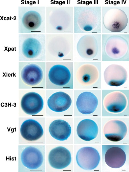 Figure 2. In Situ Hybridization of Newly Discovered Localized mRNAsIn situ hybridization toXcat-2 mRNA and Xpat mRNAs demonstrates examples of RNAs that localize via the early pathway. Note that most of the RNA is associated with the mitochondrial cloud in stage I oocytes, with little background in the rest of the cytoplasm. By stage II, these RNAs have migrated with the cloud to the vegetal cortex, and there is no detectable RNA in the remaining cytoplasm. Xlerk, which was identified by computational screening of Xenopus 3′ UTRs for highly significant clusters of CAC-containing motifs, follows the intermediate pathway in which localization to the cloud of stage I oocytes is clearly visible but there is also a high level of signal in the remaining cytoplasm. During stage II, labeling is observed both in the cloud at the cortex and in the remaining cytoplasm. However, by stage III, no cytoplasmic labeling is detected, and all Xlerk RNA is localized to the vegetal pole. By stage IV, this labeling pattern is broader than that of either Xcat-2 or Xpat. C3H-3, also determined computationally to contain CAC-rich clusters in its 3′ UTR, utilizes the late, or Vg1, pathway. In this case, localization does not begin until stage II, and background labeling is observed through stage III. By stage IV of oogenesis, however, this late-pathway RNA shows no labeling in the animal hemisphere. Vg1 is shown as a known example of late-pathway localization, and histone mRNA (Hist), which is expressed throughout the cytoplasm of stage I–IV oocytes, is shown as a negative control for localization. The scale bar represents 100 μm in all panels.