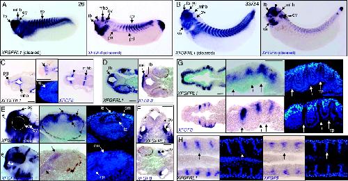 Figure 4. Spatiotemporal expression of XFGFRL1/Xndk and XFGF8 at tail bud stages visualized by whole-mount in situ hybridization. The expression of XFGFRL1 is compared with that of XFGF8 as indicated (XFGFRL1 in black; XFGF8 in blue). ldquo cleared, rdquo embryos were treated with benzyl benzoate/benzyl alcohol to become transparent. A,B: Lateral view. Anterior toward the left; dorsal is upward. Arrowheads (right panels; see also C, right panel) indicate the region that probably corresponds to the boundary of prosomeres 2 and 3 in the diencephalon (see text). C-H: Comparison of XFGFRL1 (left or upper panel) and XFGF8 (right or lower panel) expression by horizontal or transverse (F, upper panel) sections of stage 33/34 (C-G) and stage 26 (H) embryos. C: Expression in the midbrain-hindbrain boundary. Middle panels are enlargement of left panel, showing that XFGFRL1 is expressed in the pineal gland. D: Forebrain expression. XFGF8 is also expressed in anterior head mesenchyme (right panel). E: Eye expression in whole embryos (left panels) and in horizontal sections (middle and right panels). Left panels show enlargement of the head region of the embryos in B. The sections correspond to the position shown by a line with e in left panels. White dotted lines show the outline of the eyes (upper left panel) and the ciliary margin and commissural plate (lower middle panel). White arrowheads show XFGF8 expression in the eye and commissural plate (lower left panel). F: Otic vesicle expression. XFGFRL1 (upper panel) is expressed in ventral and XFGF8 (lower panel) is expressed in the anterior part of the otic vesicles. G: Visceral arch expression. Middle and right panels show enlargement of left panels. Both XFGFRL1 and XFGF8 are expressed in the visceral pouches as indicated by arrows. Turquoise staining seen in the expression of XFGFRL1 was due to depletion of nitro blue tetrazolium inside of embryos by strong staining of the ectodermal region. Thus, XFGFRL1 expression (shown in blue and turquoise) is wider than that of XFGF8. H: Somite expression. Staining is localized to nuclear and perinuclear regions as indicated by arrows. XFGFRL1, Xenopus fibroblast growth factor receptor-like 1; XFGF8, Xenopus fibroblast growth factor-8; cm, ciliary margin; cp, commissural plate; ey, eye; fb, forebrain; le, lens epithelium; me, mesenchyme; mhb, midbrain-hindbrain boundary; ov, otic vesicle; pd, pronephric duct; pg, pineal gland; pn, pronephros; so, somite; tz, transitional zone; va, visceral arch; vp, visceral pouch. Scale bar = 100 mu m. Image published in: Hayashi S et al. (2004) Copyright © 2004. Image reproduced with permission of the Publisher, John Wiley & Sons.