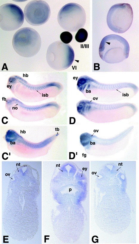 Fig. 2. Expression of Xlrp5 and Xlrp6 during development. (A) Expression of Xlrp6 during oogenesis. Transcripts are uniformly expressed in early stages (II/III) and accumulate in the animal pole of stage VI oocytes (arrowhead). (B) Expression of Xlrp6 in stage 18 embryos. Staining is enriched in dorsal tissues (arrowhead). (C,C′) Xlrp5 expression in stage 28 (C) and stage 35 (C′) embryos. (D,D′) Xlrp6 expression in stage 28 (D) and stage 35 (D′) embryos. (E–G) Transverse sections at the hindbrain level through Xlrp5 (E) or Xlrp6 (F,G) stained stage 35 embryos. ba, branchial arches; ey, eye; fb, forebrain; fg, foregut; hb, hindbrain; isb, intersomite boundary; no, notochord; nt neural tube; ov, otic vesicle; p, pharynx; tb, tailbud.
