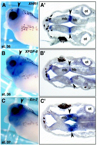 Fig. 4. Comparison of expression of XHR1 with that of XFGF-8 and En-2 at tailbud stages. (AâC) Lateral view of stages 36â37 embryos hybridized for XHR1, XFGF-8, and En-2. (Aâ²âCâ²) Horizontal sections of the embryos in (AâC). Anterior is to the left. Arrowheads, MHB; mb, midbrain; hb, hindbrain; ey, eye; ot, otic vesicle; st., developmental stage. Image published in: Shinga J et al. (2001) Copyright © 2001. Image reproduced with permission of the Publisher, Elsevier B. V.