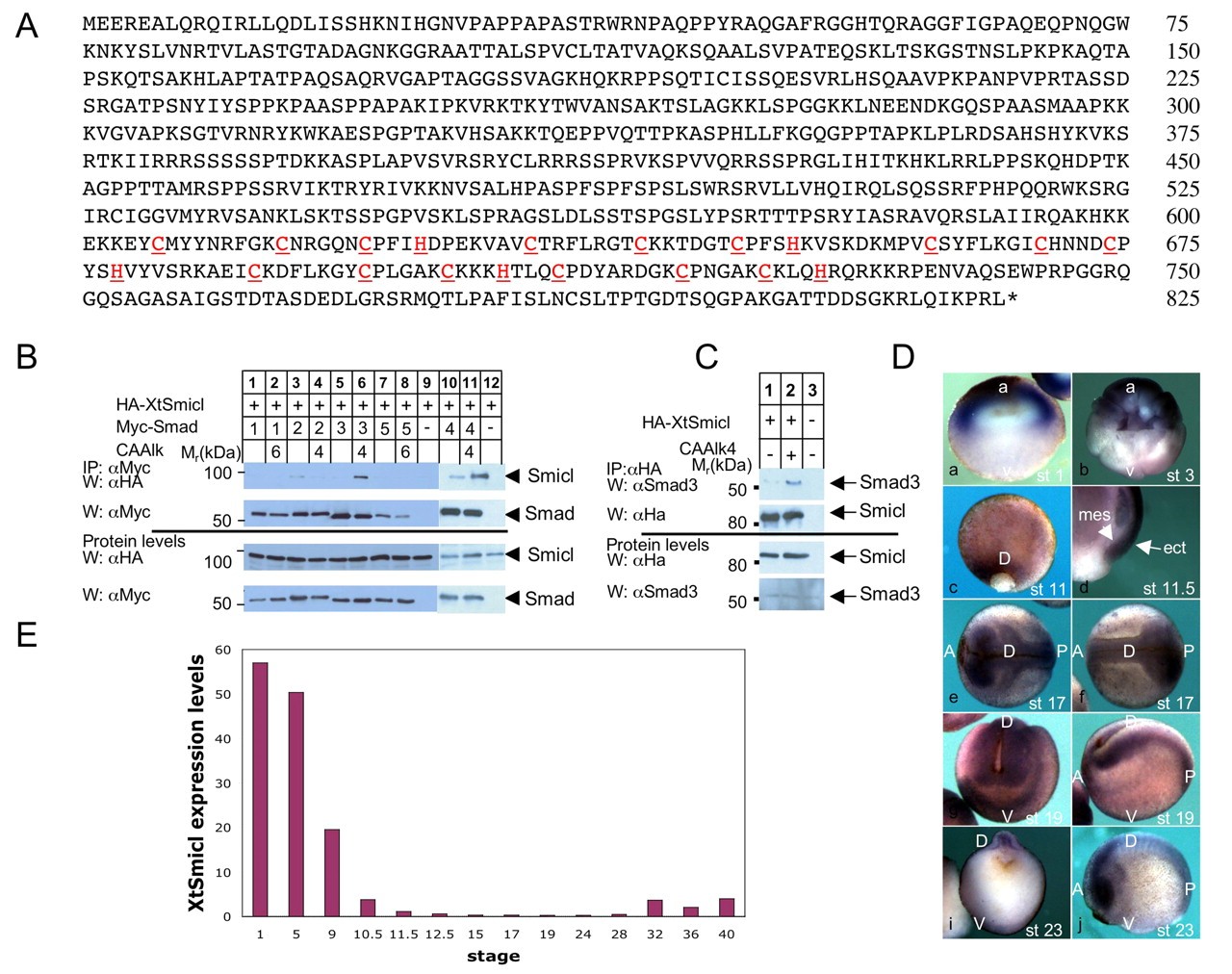 Fig. 1. Smicl is a Smad-interacting protein that is expressed maternally and then zygotically during Xenopus development. (A) Amino acid sequence of XtSmicl, a novel Smad interacting protein. Conserved cysteines and histidines in the zinc fingers are underlined. (B) Smicl interacts with Smad3 and Smad4. HA-tagged XtSmicl was expressed in HEK293T cells with plasmids encoding Myc-tagged Smad1, Smad2, Smad3, Smad4 or Smad5 in the presence or absence of the appropriate constitutively active type I receptor. Samples were immunoprecipitated (IP) using an anti-Myc antibody and the presence of HA-XtSmicl was analysed by western blotting (W). (C) Smicl interacts with endogenous Smad3. HA-tagged XtSmicl was expressed in HEK293T cells in the presence or absence of caALK4. Samples were immunoprecipitated with anti-HA coupled beads and the presence of endogenous Smad3 was analysed by western blotting. (D) Expression pattern of Xenopus tropicalis Smicl studied by whole-mount in situ hybridisation. Stages (st) are indicated. a, animal; v, vegetal; D, dorsal; V, ventral; A, anterior; P, posterior; mes, mesoderm; ect, ectoderm. Smicl is expressed maternally and transcripts are particularly abundant in the animal hemisphere of the fertilised egg. These results were confirmed by in situ hybridisation experiments carried out on bisected embryos to facilitate penetration of the probe in the vegetal hemisphere of the embryo. In situ hybridisation using a sense probe revealed no background staining (data not shown). (E) Quantitative RT-PCR confirms the presence of high levels of Smicl RNA in the fertilised egg of Xenopus tropicalis. Significant zygotic expression of Smicl begins at tadpole stage 32. Image published in: Collart C et al. (2005) Copyright © 2005. Image reproduced with permission of the Publisher and the copyright holder. This is an Open Access article distributed under the terms of the Creative Commons Attribution License.