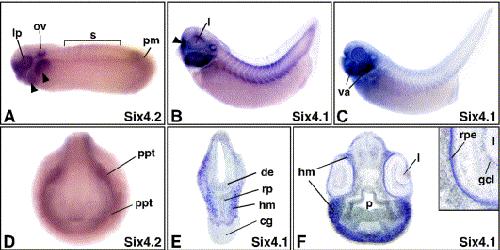 Fig. 4. Analysis of Xenopus Six4 gene expression during embryonic development. (A) Lateral view of a stage 26 embryo stained for Six4.2. The arrowheads indicate expression in the developing visceral arches. (B) Lateral view of a stage 34 embryo stained for Six4.1. The arrowhead shows the developing olfactory bulb. (C) Lateral view of a stage 39 embryo displaying widespread Six4.1 expression in the visceral arches (va). (D) Frontal view of a stage 22 embryo illustrating widespread Six4.2 in the primitive placodal thickening (ppt). (E) Transverse section of a stage 32 head cut at the level of the cement gland (cg) showing Six4.1 expression in the head mesenchyme (hm). (F) Transverse section through the head of a stage 39 embryo. Inset shows Six4.1 expression in the eye. Abbreviations: de, diencephalon; gcl, ganglion cell layer; hm, head mesenchyme; l, lens; lp, lens placode; ov, otic vesicle; pm, unsegmented paraxial mesoderm; rp, Rathke's pouch; rpe, retinal pigment epithelium; s, somites. Image published in: Ghanbari H et al. (2001) Copyright © 2001. Image reproduced with permission of the Publisher, Elsevier B. V.