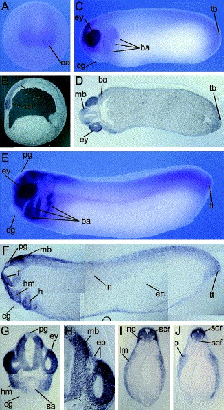 Fig. 2. Expression of karyopherin-β3 in Xenopus embryos. Whole-mount in situ hybridisation with Xenopus karyopherin-β3 antisense RNA. (A) A frontal view and (B) a parasagittal section at the neural fold level (stage 16) show strong expression of karyopherin-β3 in the ea, eye-Anlage and weaker expression in the sln, sensorial layer of the neuroectoderm. (C) A lateral view of a stage 23 embryo reveals karyopherin-β3 transcripts in the ey, eye, ba, branchial arches and in the tb, tailbud. No expression is visible in the cg, cement gland. (D) A horizontal section of stage 23 shows strong expression in the eye and branchial arches. Lower expression levels are detectable in the mb, midbrain and tb, tailbud. (E) In a stage 29 embryo (also shown in FâJ) karyopherin-β3 transcripts are localized in the eye, the branchial arches, the tt, tailtip and in the fore-/midbrain regions exept the pg, pineal gland. (F) In the parasagittal section of a late tailbud embryo, karyopherin-β3 expression is visible in the h, heart, tailtip, f, forebrain, midbrain and hm, head mesenchyme. No expression is detectable in the cement gland, n, notochord and en, endoderm. (G) The frontal section of the eye/midbrain level shows strong expression enhancement in the eyes and dorsal regions of the midbrain, a weaker signal is detected in the midbrain floor and hm, head mesenchym. No expression is visible in the cement gland, sa, stomodeal anlage and pineal gland. (H) Partial magnification of (G) shows a differential distribution of the midbrain and no signal in the ep, epidermis. (I) Frontal section just behind the head with strong expression in the nc, neural crest, scr, spinal chord roof, and lm, lateral mesoderm. (J) Posterior section of the embryo. The expression in neural crest cells becomes weak. Enhancement of expression is visible in the p, pronephros region and in the spinal cord roof, weak expression is detectable in the scf, spinal chord floor. Image published in: Wischnewski J et al. (2000) Copyright © 2000. Image reproduced with permission of the Publisher, Elsevier B. V.