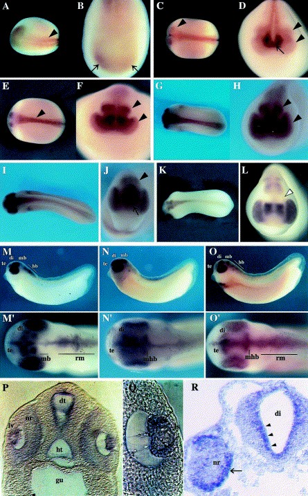 Fig. 4. Whole-mount in situ hybridization of Xerl. (A) Dorsal view (st.15). Anterior is left. Arrowhead indicates posterior part of neural groove. (B) Anterior view of (A). Arrows show anterior part of neural plate. (C) Dorsal view (st.17). Anterior is left. Arrowhead indicates anteriorly bilateral expression. (D) Anterior view of (C). Arrowheads indicate anteriorly bilateral expression. Arrow indicates hypothalamus primodia. (E) Dorsal view (st.20). Anterior is left. Arrowhead indicates neural tube. (F) Anterior view of (E). Arrowheads indicate eye anlage and future midbrain. (G) Dorsal view (st.24). Anterior is left. (H) Anterior view of (G). Arrowheads indicate same region in (D,F). (I) Dorsal view (st.28). (J) Anterior view of (I). Arrowhead indicates midbrain expression. Arrow shows diencephalic expression. (K) Xpax6 expression (st.25). (L) Anterior view of (K). White arrowhead indicates blank of expression at midbrain. (M,Mâ²) Xpax6 expression (st.32). (N,Nâ²) Xtll expression (st.32). (O,Oâ²) Xerl expression (st.32). (MâO) Lateral view. (Mâ²âOâ²) Highly magnified dorsal view. (P,Q) Transverse section of the whole embryo stained with Xerl probe at st.32. (P) Midbrain. (Q) Lens vesicle. Arrows indicate remarkable expression at the lens equator zone. (R) In situ hybridization on the tissue sectioned at diencephalic level (st.32). Arrowheads indicate Xerl expression near the apical surface of ventricular zone. Arrow indicates Xerl expression of outer layer of neural retina. mb, midbrain; rm, rhombomere; mhb, mid-hindbrain boundary; te, telencephalon; di, diencephalon; ey, eye; gu, gut; lv, lens vesicle; nr, neural retina; dt, dorsal thalamus; ht, hypothalamus; ls, lens. Image published in: Kuriyama S et al. (2000) Copyright © 2000. Image reproduced with permission of the Publisher, Elsevier B. V.