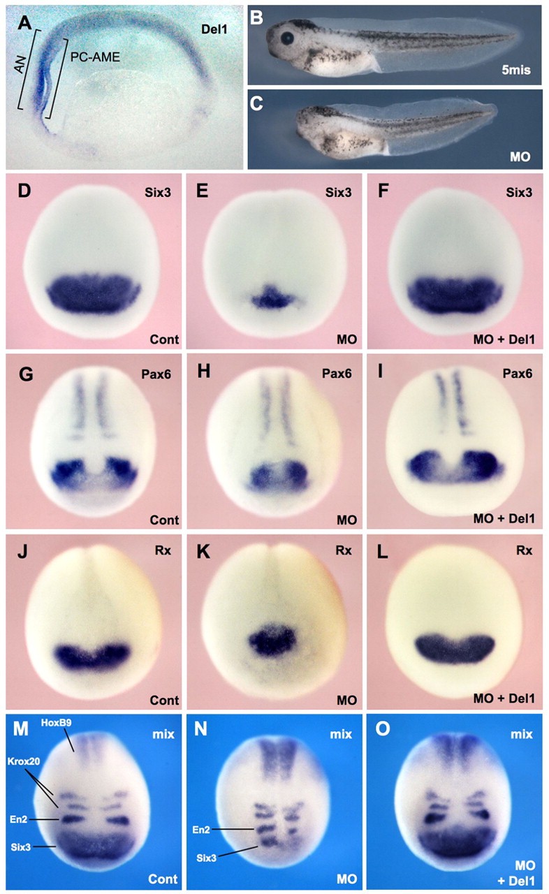 Fig. 3. Del1 is essential for the formation of anterior brain tissues. (A) Expression pattern of Del1 at the early neurula stage (sagittal section; anterior side is left). AN, anterior neuroectoderm; PC-AME, prechordal anterior mesendoderm. (B,C) Effects of animal cell injection of 5mis-MO (12.5 ng) or Del1-MO (12.5 ng) at the 8-cell stage. (D-O) Effects on expression of neural markers of animal cell injection of Del1-MO (25 ng) at the 8-cell stage (E,H,K,N). These effects were rescued by co-injecting MO-insensitive Del1 mRNA (100 pg) (F,I,L,O). Compare with controls (D,G,J,M). mix, mixed probes (Six3, En2, Krox20 and HoxB9).