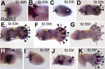 Figure 1. Raldh2 shows dynamic expression in the mesenchyme during limb development. Roman numerals I–V indicate forming digits of the autopod, and lowercase “h” following st. indicates hindlimb whereas “f” indicates a forelimb. Limbs are proximal to the left and posterior uppermost and viewed from the dorsal side, except in B where both hindlimbs are viewed from the ventral side of the tadpole. A, B: In very early hindlimb buds, expression is proximal (black arrow). C: By st. 51, expression is limited to proximal-most cells (black arrow) with lower levels of expression distally (white asterisk). D: Additional expression domains appear in the anterior at st. 52, one either side of the hindlimb (white arrows) and one posteriorly (yellow arrow). Distal expression is resolving into interdigital staining (black arrowheads). E: Interdigital expression is in four domains at st. 53 (black arrowheads). A small area begins to express Raldh2 in the anterior zeugopod region (yellow arrow). F: In st.54 hindlimbs, expression is interdigital (black arrowheads), and is still seen in proximal (black arrow), proximal/anterior (white arrow), and anterior and posterior zeugopod patches (yellow arrows). G: As the hindlimb digits form, Raldh2 is limited to cells surrounding cartilage and proximal expression disappears. H, I: In early stage forelimbs, expression is also only proximal (black arrow). J: Forelimb expression at st. 53. Proximal (black arrow), proximal/anterior (white arrow), and interdigital domains (arrowhead). K: As the forelimb digits form, Raldh2 is limited to cells surrounding cartilage and proximal expression disappears.