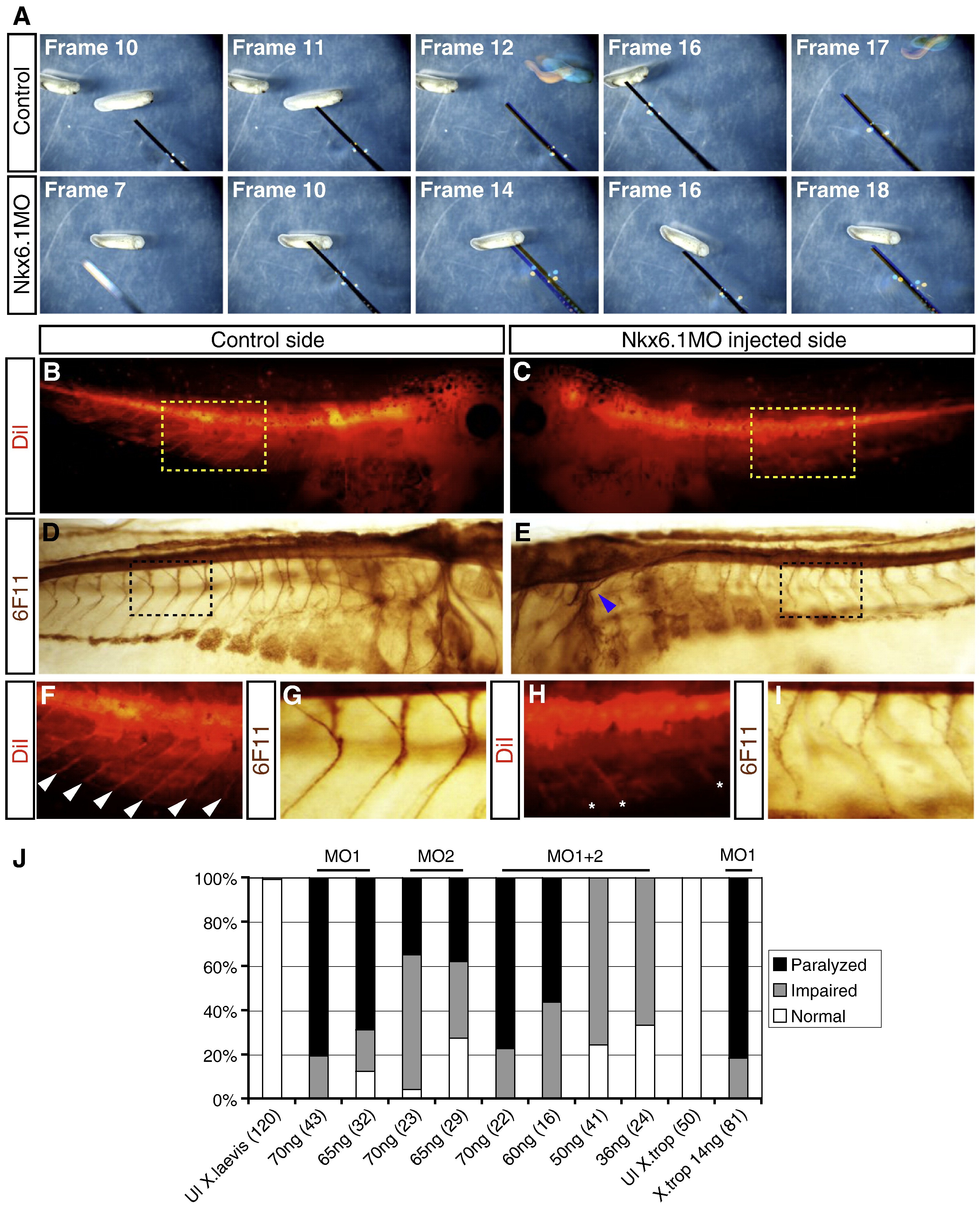 Fig.6. Nkx6.1 knockdown results in paralysis and axon misguidance. (A) Narrative frames from a time lapse series showing uninjected controls (top panel) and Nkx6.1MO injected embryos (bottom). Uninjected embryos initiate escape reflex when poked with a pipette tip (frames 12 and 17; pipette tip painted black). Poking of Nkx6.1MO injected embryos does not trigger escape reflex (bottom). Nkx6.1MO injected embryos were injected in both blastomeres at the 2-cell stage. (B,C,F,H) Orthograde DiI-labeling of stage 39/40 embryos injected unilaterally with Nkx6.1MO. (B) Control side showing labeled nerve fibers emanating from the neural tube. (C) Nkx6.1MO injected side show labeled nerves. (D,E,G,I) Immunostaining for N-CAM using antibody 6F11 showing axonal extensions. (D) Uninjected side of stage 39/40 tadpole showing nerve fibers protruding from the spinal cord and hindbrain. (E) Nkx6.1MO injected side of same tadpole does have greatly reduced and disorganized axons and cranial nerves are severely affected (blue arrowhead). (F, H) High magnification of boxes in (B) and (D), respectively. White arrow heads in (F) indicate DiI labeled axons. (H,I) High magnification of boxes show in (C) and (E), respectively. Asterisks in (H) indicate fluorescence from the uninjected side out of the plane of focus. (J) Effect of different MO1 and MO2 doses, individually and in combination, on tadpole mobility. Embryos were injected in all blastomeres at the one or two cell stage. Total MO amount injected is listed under bar. Number in parenthesis indicates number of embryos analyzed. MO1Â +Â 2 injections were performed with equal amounts of each. The two last bars show effect on MO1 when injected into X. tropicalis. Embryos were scored at stages 32â39. Image published in: Dichmann DS and Harland RM (2011) Copyright © 2011. Image reproduced with permission of the Publisher, Elsevier B. V. Larger Image Printer Friendly View |