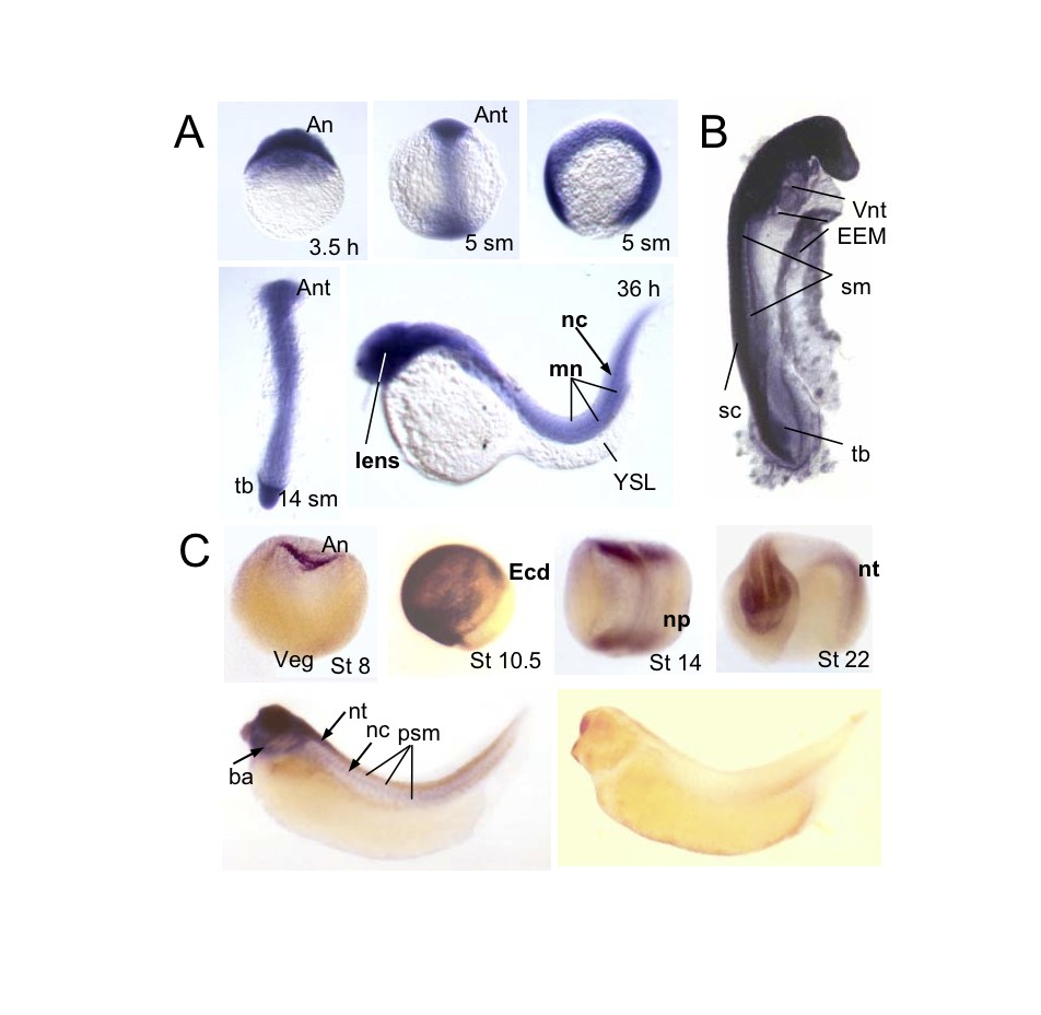 Fig. S3. Kaiso is a ubiquitously expressed methyl-dependent transcriptional repressor. Kaiso whole-mount RNA in situ hybridization on zebrafish (A), chicken (B) and Xenopus (C) embryos. The stages of development for Xenopus and hours after fertilisation for zebrafish embryos are indicated. An, animal pole; Veg, vegetal pole; Ant, anterial part of the embryo; Ecd, ectoderm; np, neural plate; nc, notochord; nt, neural tube; sc, spinal cord; tb, tailbud; mn, motoneurons; psm, perisomitic mesoderm; ba, branchial arches; sm, somites; YE, yolk extension layer; EEM, extraembryonic membranes; Vnt, ventral neural tube. Image published in: Ruzov A et al. (2009) Copyright © 2009. Image reproduced with permission of the Publisher and the copyright holder. This is an Open Access article distributed under the terms of the Creative Commons Attribution License.