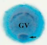 kif3b (kinesin family member 3B) expressionin Xenopus laevis, assayed by in situ hybridization in oocyte stage I, vegetal view. (GV = germinal vesicle, arrow points to mitochondrial cloud).