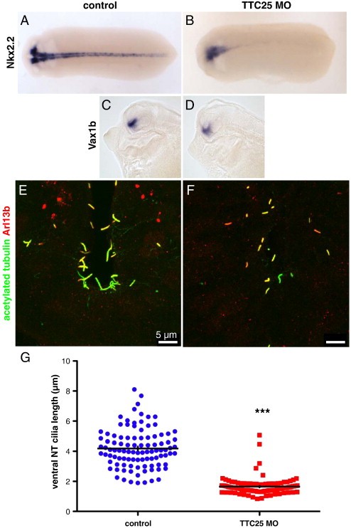 Fig. 7. TTC25 is required for proper neural tube cilia formation and Shh signaling pathway. (A–B) Nkx2.2 expression at stage 24, dorsal view, anterior left. Expression of Nkx2.2 in the ventral neural tube (A) is reduced in the spinal cord of TTC25 morphants (B). (C–D) Vax1b expression at stage 35, lateral view, anterior left. Expression of Vax1b in the ventral forebrain (C) is reduced, but still present, in TTC25 morphants (D). (E–F) Confocal Z-projections of stage 24 neural tube sections stained for cilia markers acetylated α-tubulin (green)and Arl13b (red). (E) In control embryos, most cilia project into the lumen of the neural tube; ventral neural cilia are longer than dorsal ones and express less Arl13b. (F) In TTC25 morphants, the neural tube fails to close and cilia are not found at the luminal boundary (top). Cilia are fewer, shorter, and stain more intensely with Arl13b. (G) Ventral cilia were measured in 3 sections (as in E, F) from 5 embryos each. The 20 longest ventral cilia from each embryo are plotted. Horizontal lines indicate the mean, vertical lines SEM, pb0.0001 Mann–Whitney test.