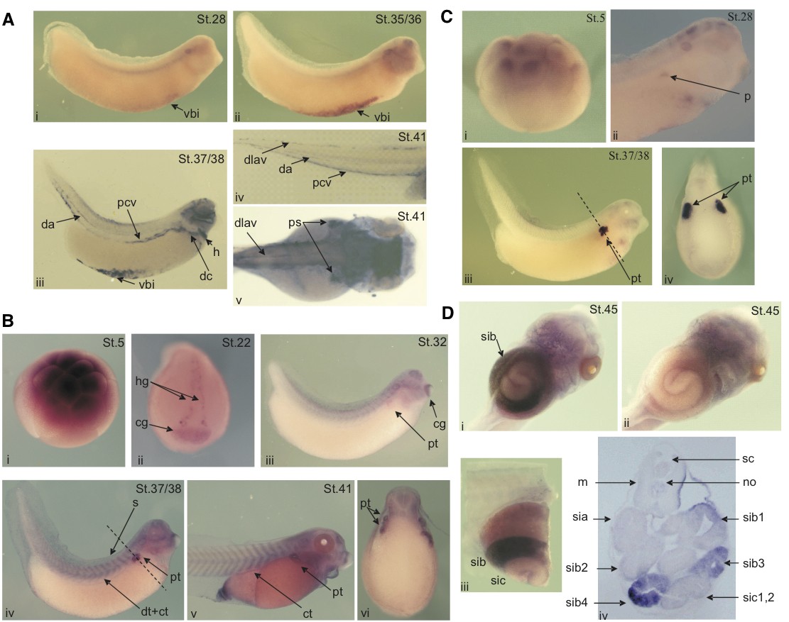 Fig. 6. Spatial expression profile of enpp1, 4, 6 and 7 during development. Whole mount in situ hybridisation with DIG-labelled antisense RNA probes was performed on embryos from stages 5-41 for enpp1, 4, 6 and stages 32-45 for enpp7. All embryos were analysed from the same experimental set. The differences in colours result from clearing the embryos and photographing them against a white background to visualise staining. (A) Whole-mount in situ hybridisation analysis of enpp1 expression. Lateral view at stages 28 (i), 35/36 (ii) and 37/38 (iii). Detail of the fin at stage 41 (iv) and dorsal view of a stage 41 embryo (v). Anterior is right and dorsal is up, except in (v). da, dorsal aorta; dc, duct of cuvier; dlav, dorsal longitudinal anastomosing vessel; h, heart; pcv, posterior cardinal vein; ps, pronephric sinus; vbi, ventral blood island. (B) Whole-mount in situ hybridisation analysis of enpp4 expression. Animal view at stage 5 (i), anterior view at stage 22 (ii), lateral view at stages 32 (iii), 37/38 (iv) and 41 (v). For the lateral views, dorsal is up and anterior is right. Transverse sections at stage 37/38 through the proximal tubules (vi). Dorsal is up. The dotted line through the pronephric tubules (iii) correspond to planes of section in (vi). cg: cement gland; ct, collecting tubules; dt, distal tubules; hg, hatching gland; pt, proximal tubules; s, somites. (C) Whole-mount in situ hybridisation analysis of enpp6 expression. Lateral view at stage 5 (i), lateral view at stage 28 (ii) and 37/ 38 (iii). Dorsal is up and anterior is right. Transverse sections in the proximal tubules level at 37/38 (iv). The dotted line through the pronephric tubules correspond to planes of section in (iv). p, pronephros; pt, proximal tubules. (D) Whole-mount in situ hybridisation analysis of enpp7 expression. Ventral view of stage 45 embryos hybridized with anti-sense (i) and sense (ii) probe, lateral view of the gut region of a stage 45 embryo (iii), cryostat section (iv) at 28μm of a stage 45 embryo through the gut. no, notochord; m, muscles; sc, spinal cord; sia, first sections of the small intestine; sib, external coil of small intestine; sic, internal coil of small intestine (from Chalmers and Slack, 1998).