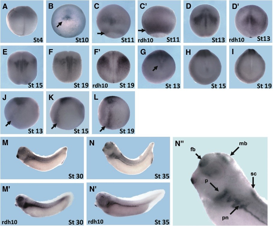 rdh10.Lrdh10-a, rdh10-b, SDR16C4, XRDH10, XRDH10a, XRDH10bX. laevisThroughout NF stage 13chordal neural plate