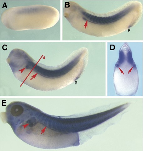 Fig. 3. Expression pattern of aspartate aminotransferase. Lateral view for all embryos, except for (D). (A) A stage 23 early tail-bud embryo. (B) Stage 30, with strong expression in the somites, pronephric duct (arrow). Expression also appears in the proctodium (p). (C) Stage 35. Additional expression site is found in the pronephros anlag (arrow head). (D) Section from the line in (C), showing expression in somites and pronephros (arrows). (E) Stage 41. Image published in: Bourdelas A et al. (2009) Copyright © 2009. Image reproduced with permission of the Publisher, University of the Basque Country Press.
