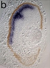 arrb2 (arrestin, beta 2 ) gene expression in Xenopus laevis embryos, NF stage 35, as assayed by in situ hybridization, section through the developing eye. This image is extracted from figure published in: Wu HY et al. (2009), Image published in: Wu HY et al. (2009) Copyright © 2009. Image reproduced with permission of the Publisher, Elsevier B. V.