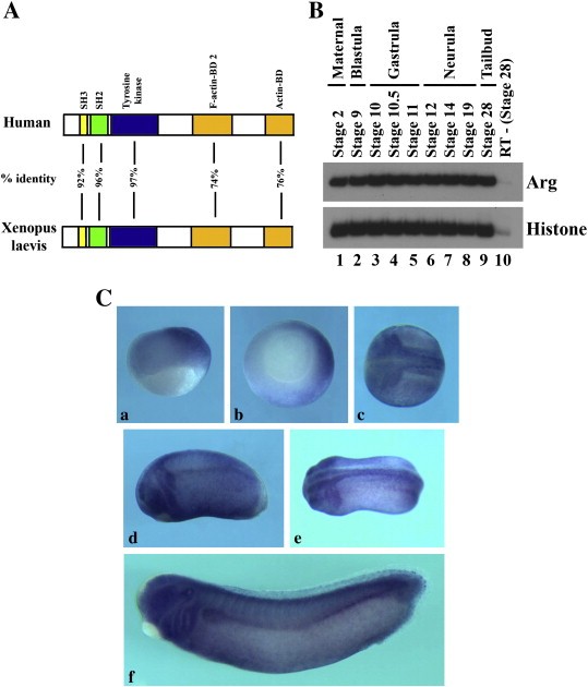 Fig. 1. Expression of Arg during early Xenopus development. A) Schematic representation of sequence alignment between human and Xenopus Arg proteins. The SH2, SH3 and tyrosine kinase domains are over 92% identical, while the actin binding domains (BDs) are 74â76% identical between the two proteins. B) Temporal expression of Arg assayed by RT-PCR (25 cycles) showed that Arg was expressed maternally and its transcripts persisted till at least tailbud stages. C) Spatial expression of Arg assayed by in situ hybridization of gastrula (panels a and b), neurula (panel c), tailbud (panels d and e) and early tadpole (panel f) embryos. The orientations of the embryos are: panel a, side view with dorsal to the right; panel b, vegetal view with dorsal to the right; panels c and e, dorsal view with anterior to the left; panels d and f, side view with anterior to the left. Image published in: Bonacci G et al. (2012) Copyright © 2012. Image reproduced with permission of the Publisher, Elsevier B. V.