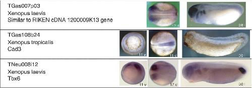 Fig. 12. Regionalized expression pattern of clones giving rise to posterior defects. Three clones from this synphenotype group gave rise to restricted expression patterns. The images are ordered by clone name. For each clone the species and annotation of the closest matching blastx hit is shown. Abbreviations are: d, dorsal view (stage 15 and 17); l, lateral view (stage 28 and 30); v, vegetal view (stage 11).