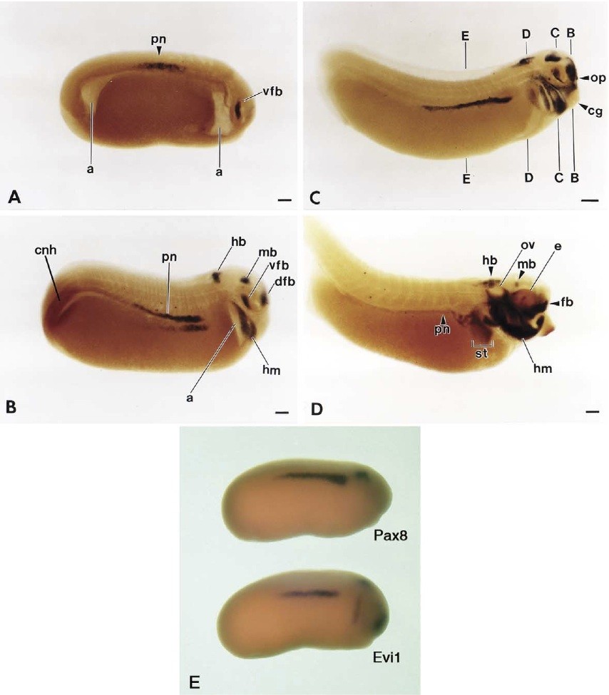 Fig. 3. Whole mount RNA in situ localization of Evi-1 transcripts during Xenopus development. Anterior is to the right in all panels. Representative cleared embryos of increasing age are shown (A) stage 22, (B) stage 25, (C) stage 28, (D) stage 37. Transverse section planes, Fig. 4(B)E), are indicated by the vertical labeled lines (C). Note in panel (D) the avoidance of the otic vesicle by Evi-l expressing neural crest cells. Faint Evi-l signal is visible over a localized region of the developing foregut in later tadpoles, tentatively identified as the stomach (D). Comparison of Pax8 and Evi-1 expression patterns at stage 23 indicates staining in the pronephric duct anlage (E). Scale bar: 100 mm. Abbreviations: a, archenteron (developing gut cavity); cg, cement gland; cnh, chordoneural hinge; dfb, dorsal forebrain; e, eye, hb, hindbrain; hm, head mesenchyme; mb, midbrain; op, olfactory placode; ov, otic vesicle; pn, pronephric duct; st, developing stomach; vfb, ventral forebrain.