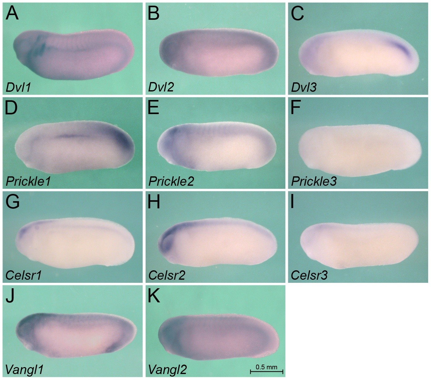 Figure 5. Expression of Wnt Signaling Intermediates at Stage 25. Whole mount in situ hybridization of Xenopus embryos at stage 25 for Dvl1 (A), Dvl2 (B), Dvl3 (C), Prickle1 (D), Prickle2 (E), Prickle3 (F), Celsr1 (G), Celsr2 (H), Celsr3 (I), Vangl1 (J) and Vangl2 (K). All images are of the same magnification and the scale bar corresponds to 0.5 mm.