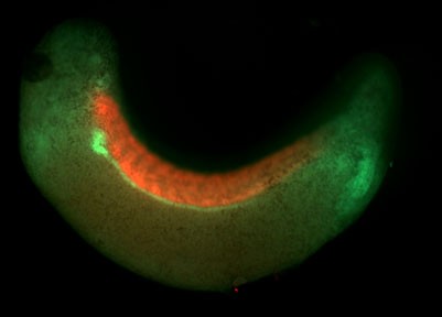 12101 staining post in situ. This embryo was stained for atp1a1 via fluorescent in situ hybridization with a green (fluorescein) tyramide then post stained with 12/101 using a TRITC secondary
