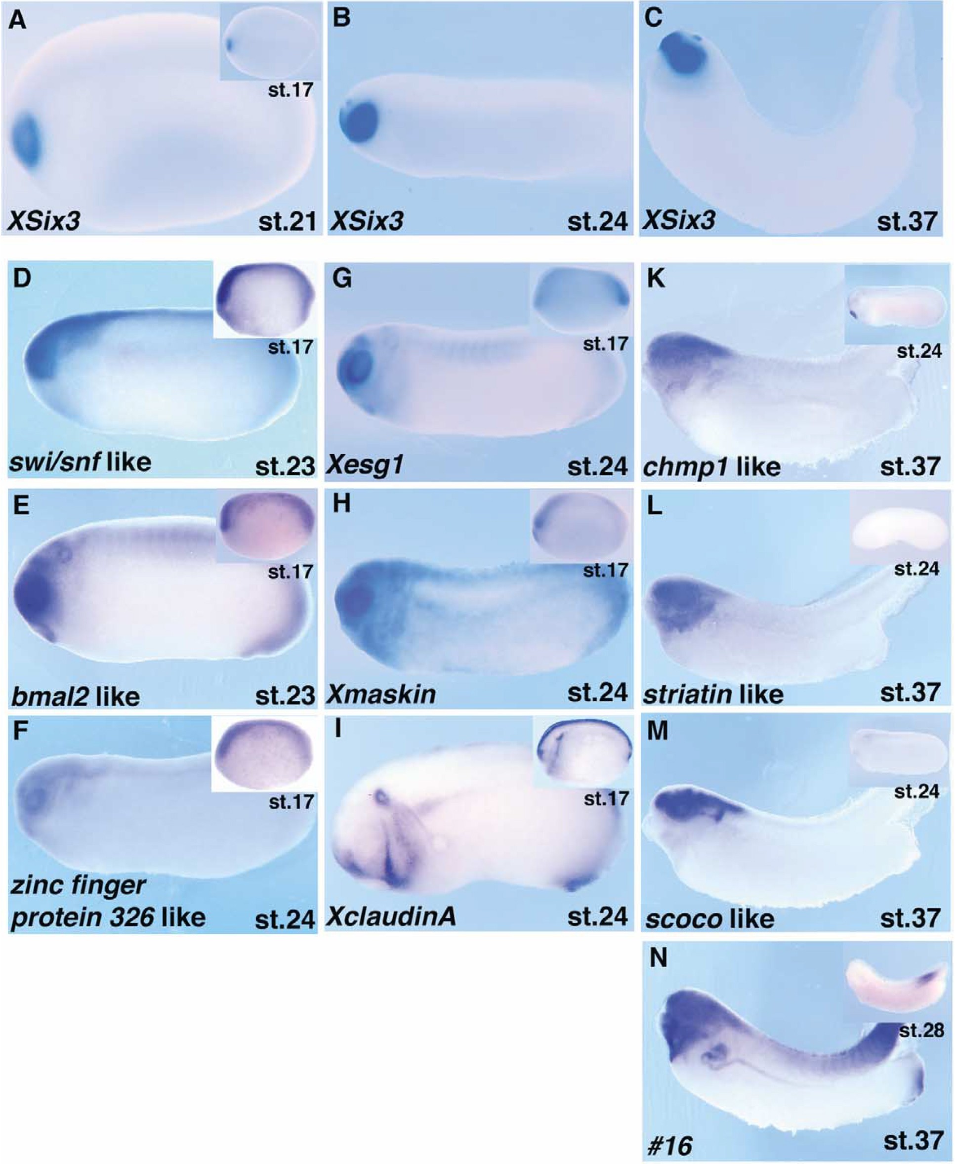 Fig. 1. Comparison of the expression domains of XSix3 and its potential interacting partners. Whole-mount in situ analysis at different developmental stages, lateral views; anterior is to the left. Clone names are indicated in the lower left corner of each picture, and stages in the lower right corner. (A) XSix3 expression at stage 17 (inset in (A)), 21 (A) 24 (B) and 37. (D) The first two columns show candidate interactors expressed at early and later stages; staining was performed at stages 23/24 and at 17 (small insets). Note that all these genes, except for XclaudinA (I), are expressed in the prospective eye and forebrain region from stage 17 onwards. (K) The third column depicts the expression of genes that are co-expressed with XSix3 only later in development (stage 24 or later). Expression domains are shown at stages 37 and 24 or 28 (small insets).
