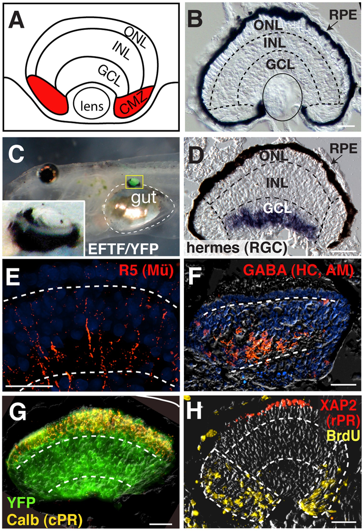 (A) Schematic illustrating the expected retinal layers of the eye including the outer nuclear (ONL), inner nuclear (INL), and ganglion cell (GCL) layers. The mitotically active CMZ is indicated in red. (B) Transverse section of a stage 41 wild-type retina. Dashed lines mark the location of the plexiform layers. The eye is oriented so that dorsal is to the left. (C) Flank eyes expressed YFP throughout, contained an RPE and a trilayered morphology with putative inner and outer plexiform layers (dashed lines in D). Markers were used to detect retinal cell classes. (C) Whole tadpole bright field image overlayed with fluorescent image, showing flank eye (yellow box) on top of gut (dashed line). Inlay is a magnified view of the boxed flank eye. (D) Cryostat section (12 ) shows cells labeled for the retinal ganglion cell (RGC) marker, hermes, by in situ hybridization. (E) R5 antibody labels Mler glia (M red), which extend processes the breadth of the flank retina. (F) GABA labels horizontal and amacrine cells (HC, AM; red) of the INL. (G) Cells expressing YFP (green) co-express the cone photoreceptor (cPR) marker Calbindin (yellow). (H) Cells expressing the rod photoreceptor marker XAP2 (rPR; red); BrdU-immunoreactivity (yellow) identifies mitotically active cells in the periphery of the same flank retina. Scale bars, 25 . Image published in: Viczian AS et al. (2009) Viczian et al. Creative Commons Attribution license Larger Image Printer Friendly View |