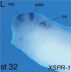 sp5 (Sp5 transcription factor) gene expression in Xenopus laevis embryos, NF stage 32, as assayed by in situ hybridization. Lateral view: anterior left, dorsal up. This image is extracted from figure published in: Ossipova O et al. (2002), Image published in: Ossipova O et al. (2002) Copyright © 2002. Image reproduced with permission of the Publisher, Elsevier B. V.