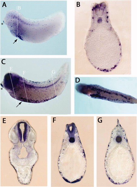 Figure 6. Expression of Fermt3 at stage 28 and 35. A, B:Fermt3 transcripts are detected at stage 28 in the cement gland (asterisk), notochord, anterior ventral blood islands (back arrow), and in early myeloid progenitor cells. White line in A indicates the level at which this section (B) is taken. C: By stage 35, expression of Fermt3 is visible in the cement gland (C, asterisk), central nervous system (C, E, F), ventral blood islands and vitelline veins (5C, black arrow, D, F), notochord (C, F, G), and in myeloid cells (C, D, F, G). Ventral view of a stage-35 embryo is shown is D and transverse sections are presented (E), the levels of which are demarcated by white lines (C). Image published in: Canning CA et al. (2011) Copyright © 2011. Image reproduced with permission of the Publisher, John Wiley & Sons.