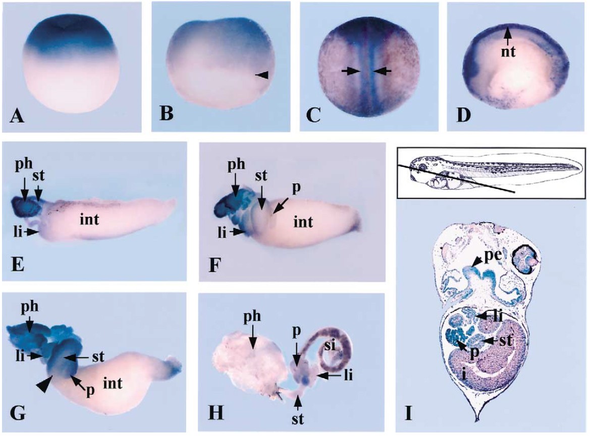 Fig. 3. Localization of Xamp transcripts in whole embryos and isolated guts. (A) The lateral view of a fertilized egg showing that maternal transcripts of Xamp are localized in the animal region of egg. (B) The dorsolateral view of an early gastrula embryo (stage 10). Xamp mRNA is restricted to the dorsal ectoderm. Arrowhead indicates the dorsal lip of blastopore. (C) The dorsal view of a neurula embryo (stage 18). Xamp is expressed in the prospective sensory neuron area of the neural tube (arrow). (D) A sagittal section of stage 18/19 embryo showing Xamp expression in the most dorsal region of neural tube (nt). (E) Isolated whole guts. (E) Stage 36 embryonic gut shows Xamp localization in the developing pharynx (ph). Anterior is to the left. (F) Left side view of Xamp expression in the stage 38/39 gut. Xamp is expressed in pharynx (ph) and liver bud (li) of foregut. (G) Ventrolateral view of stage 41 gut. Xamp is expressed in the pharynx (ph) and foregut including liver (li), pancreas (p), and stomach (st). The posterior expression boundary of Xamp expands to the transitional zone/intestine boundary (arrowhead). (H) Fully differentiated stage 49 gut. No positive signaling is detected at this stage. (I) A frontal section of the stage 42 tadpole shows that Xamp expression is detected in the endoderm of pharynx and foregut-derived organs. Abbreviations: int, intestine; li, liver; nt, neural tube; p, pancreas; pe, pharyngeal endoderm; st, stomach; si, small intestine.