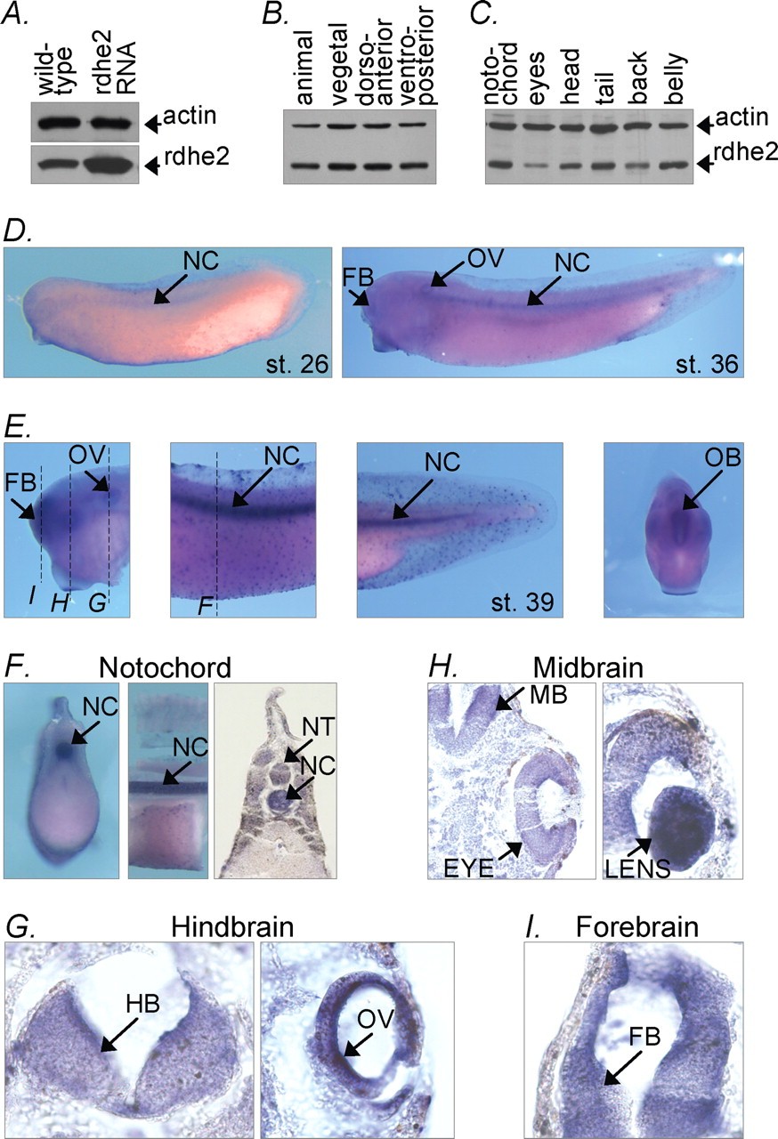 FIGURE 4. Expression pattern of endogenous rdhe2 in frog embryo. A, Western blot analysis of extracts (50 μg of total protein) of neurula stage wild-type embryos or embryos injected with in vitro synthesized rdhe2 mRNA revealing a single major band of the expected size (â¼34 kDa), which is increased in injected embryos, thus confirming that antibody is specific. B and C, Western blot analysis of dissected gastrula embryos (B) and stage 39 tadpoles (C), 30 μg of total protein per lane. D, whole mount in situ hybridization with antisense rdhe2 probe. E, in situ hybridization of dissected embryos with rdhe2 probe. Dashed lines indicate where embryos were cut in F. F, embryos stained with rdhe2 probe further dissected to better reveal staining of notochord (left, cross-section through the trunk; center, sagittal cut through the upper portion of the trunk), or paraffin-embedded and sectioned at 50 μm (right). G, 50-μm sections of prestained paraffin-embedded specimen revealing staining in the brain, eye, and otic vesicle. NC, notochord; NT, neural tube; FB, forebrain; MB, midbrain; HB, hindbrain, OV, otic vesicle; OB, olfactory bulb. Image published in: Belyaeva OV et al. (2012) Copyright © 2012. Image reproduced with permission of the Publisher and the copyright holder. This is an Open Access article distributed under the terms of the Creative Commons Attribution License.