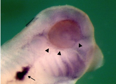 dab2 (Dab, mitogen-responsive phosphoprotein, homolog 2 (Drosophila)) gene expression in Xenopus laevis embryo, assayed via in situ hybridization, NF stage 33&34, lateral view, anterior right, dorsal up, head region only.