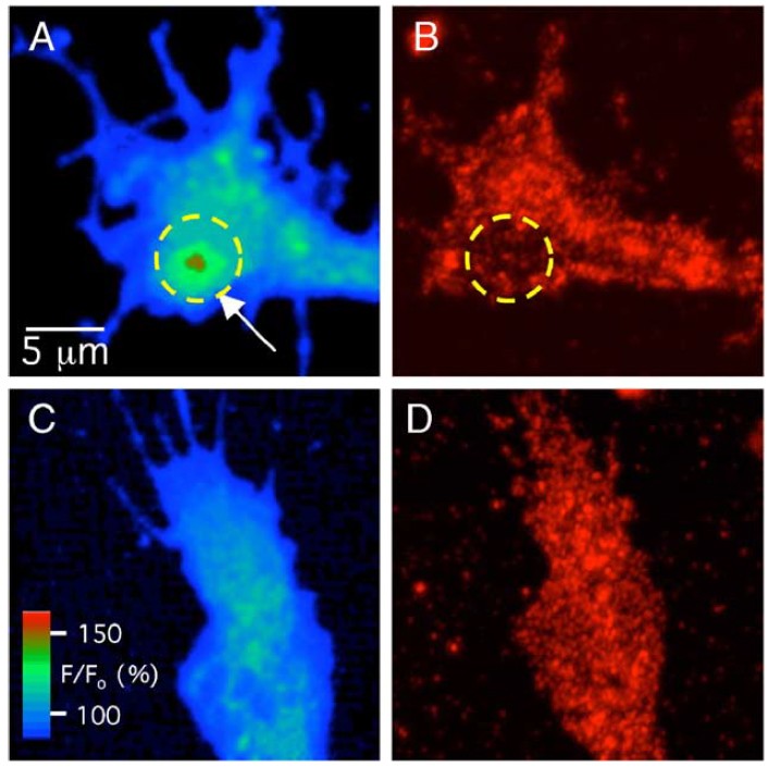Fig. 7. The site of LLT generation coincides with low pFAK immunoreactivity. (A) Fluo-4 fluorescence image of a growth cone generating an LLT (arrow). (B) pFAK immunoreactivity of the same cell 5 min following the incidence of the LLT shows reduced staining in the region of the growth cone where the LLT occurred (yellow dashed circle). This result was observed in 6 of 6 neuronal growth cones that were fixed and stained for pFAK following the observation of an LLT during Ca2+ imaging. (C) Fluo-4 image of a growth cone not generating an LLT during the period of imaging. (D) There are no regions of distinctively low intensity pFAK immunoreactivity in the growth cone. Results similar to panels C and D were obtained from 6 of 6 growth cones.