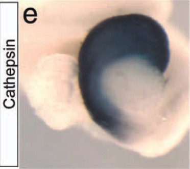 ctse (cathepsin E) gene expression in dissectd Xenopus laevis foregut, NF stage 44, as assayed by in situ hybridization. Lateral view: anterior left, dorsal up. This image is extracted from figure published in: Oropeza D and Horb M (2012), Image published in: Oropeza D and Horb M (2012) Copyright © 2012. Image reproduced with permission of the Publisher, John Wiley & Sons.