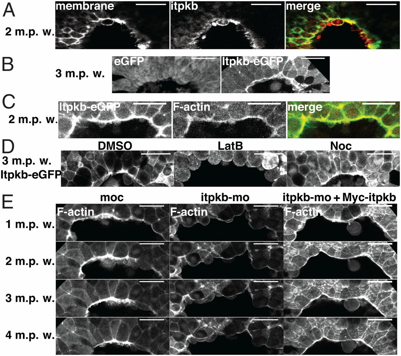 Fig. 3. Itpkb accumulates around the wound edge and modulates F-actin assembly in multicellular wounds. (A) Immunofluorescence of wounded embryos shows the accumulation of endogenous Itpkb at the wound edge. Embryos were injected with membrane GFP probe (gap-43-gfp mRNA), wounded, fixed, and stained with antibodies against GFP and Itpkb. Green, GFP; red, Itpkb. n = 6. (B) Itpkb accumulates at the leading edge of wounded cells. (Left) An animal cap wound in an embryo injected with 0.2 ng egfp mRNA as a control. (Right) An animal cap wound in an embryo injected with 5 ng itpkb-3xCâ²egfp mRNA (itpkb-eGFP). Control n = 7, itpkb-eGFP n = 8. (C) Itpkb colocalizes with the F-actin array around the wound edge. Embryos were coinjected with 1.5 ng cherry-dbmoesin mRNA and 5 ng itpkb-egfp mRNA. Green, itpkb-eGFP accumulation around wound edge; red, F-actin array around the multicellular wound; yellow, merged image of F-actin and itpkb-eGFP postwounding (p.w.). The image represents an example at 2 min p.w. n = 7. (D) The accumulation of Itpkb at the leading edge of wounded cells is F-actin�dependent. Embryos were injected with itpkb-egfp mRNA, treated with DMSO (Left), LatB (2.5 μM) (Center), or Noc (50 μM) (Right) for 30 min before wounding. Live images were taken 3 min after wounding to observe the localization of itpkb-eGFP. N DMSO = 11; N LatB = 9; N Noc = 8. (E) Itpkb knock down impairs F-actin assembly after wounding. Embryos were coinjected with 0.5 ng F-actin probe and 40 ng, itpkb-mo, or moc. Itpkb-mo embryos were also coinjected with myc-itpkb mRNA. (Left) F-actin array in moc-wounded animal cap. Middle panel shows disrupted F-actin array on itpkb-mo wounded animal. (Center) Rescued F-actin array in itpkb-mo + myc-itpkb injected embryos. N moc = 14; N itpkb-mo = 20; N rescue = 9. (Bars, 50 μm.) Image published in: Soto X et al. (2013) Copyright © 2013. Image reproduced with permission of the Publisher and the copyright holder. This is an Open Access article distributed under the terms of the Creative Commons Attribution License.