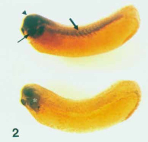 Fig. 2. Expression of CCTy in whole mount in situ preparations of stage 30 Xenopus embryos. Hybridization with an antisense RNA probe (top) identifies transcripts in the neural tube (arrowhead), pharyngeal arches (thin arrow), and dorsolateral mesoderm (thick arrow). A sense RNA probe (bottom) shows no specific cellular staining. There is faint staining in the pharyngeal cavity c); histological analysis confirms that this is not associated with cells (not shown).