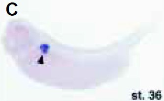 slc5a11 (solute carrier family 5 (sodium/inositol cotransporter), member 11) gene expression in a Xenopus laevis embryo as assayed by in situ hybridization, NF stage 36. Lateral view: anterior left, dorsal up This image is extracted from figure published in: Eid SR et al. (2002), Image published in: Eid SR et al. (2002) Copyright © 2002. Image reproduced with permission of the Publisher, University of the Basque Country Press.