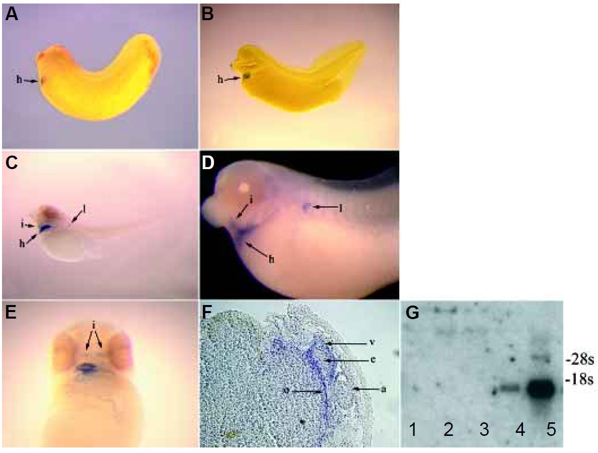 Fig. 2. Expression of MLP during Xenopus embryogenesis. (A) MLP expression is first detected at stage 27 (staged according to Nieuwkoop and Faber, 1994) in the heart (h) by whole mount in situ hybridization. (B) A stage 36 embryo showing that MLP expression (seen in blue) is still restricted to the heart at this stage. (C) At stage 40/41, MLP expression can be found in both the heart (h) and intermandibularis (i) muscle. In addition, expression was observed in the lymph heart (l) near the anterior somites. (D) An enlarged view of a stage 40/41 embryo showing the regions of expression in the head and clearly showing the lack of expression in the developing somites. (E) Ventral view of a Xenopus embryo showing the two patches of intermandibularis muscle spanning the lower jaw and expressing MLP. (F) A frontal section through the heart of a stage 38 embryo showing expression of MLP in the ventricle (v), atria (a) and outflow tracts (o) but not the endocardium (e). (G) Northern blot of adult intestine (1), kidney (2), liver (3), skeletal muscle (4), and heart (5) RNA probed with MLP. There was approximately equal loading in each lane based on rRNA levels. MLP expression is restricted to the heart and skeletal muscle. As in mammals, a higher level of expression was observed in the heart, in which a second, larger transcript was also observed (Arber et al., 1994). Image published in: Duan LJ et al. (2003) Copyright © 2003. Image reproduced with permission of the Publisher.
