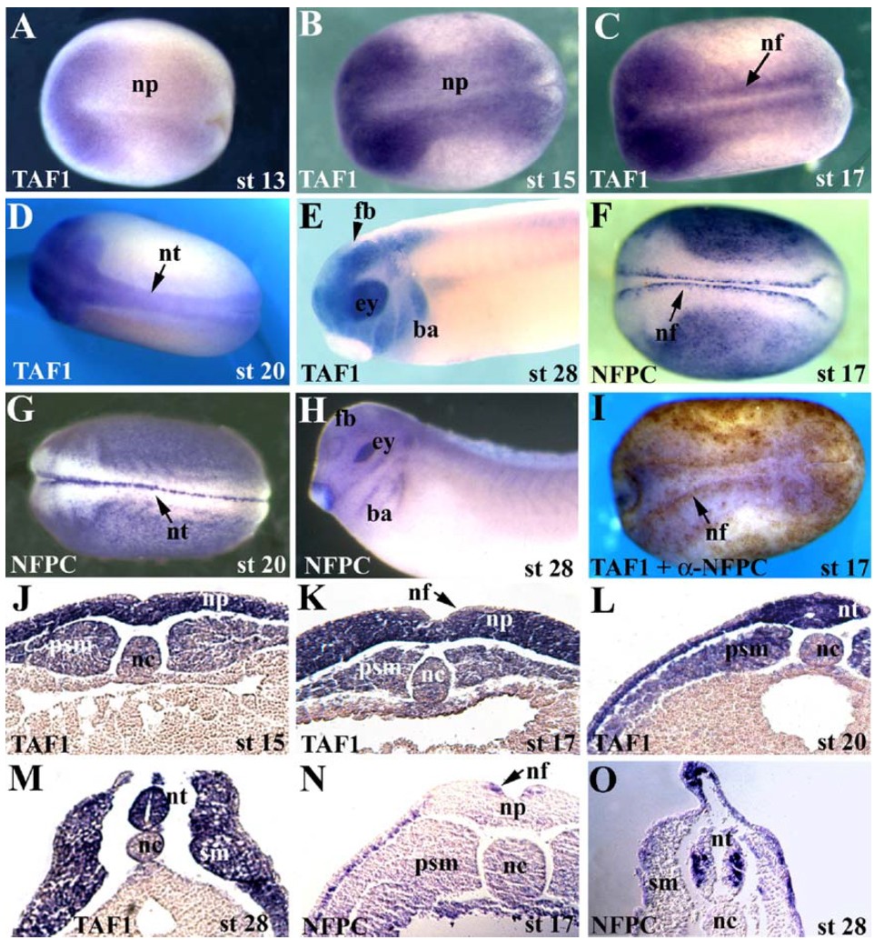 Fig. 1. Xenopus TAF1 and NFPC expression in the neural ectoderm. In situ hybridization analysis for TAF1 (A�E, I�M) or NFPC (F�H, N, O), viewed in wholemount (A�I) or in cross section (J�O). At stage 13, TAF1 is expressed throughout the neural plate (np), with highest expression anteriorly. At stages 15 (B) and 17 (C), TAF1 is expressed in the neural folds (nf). After neural tube closure, TAF1 is expressed throughout the neural tube (nt), in the eye (ey) brachial arches (ba), and forebrain (fb) (D, E). In contrast, at stage 17, NFPC expression is restricted to the tips of the neural folds (arrow in panels F and G) and in the ventral ectoderm. After neural tube closure, NFPC is also expressed in the anterior neural tube, eye, and branchial arches (H). (I) A stage 17 embryo stained by in situ for TAF1 (purple) and with an antibody to NFPC (brown) demonstrates co-localization of NFPC and TAF1 at the tips of the neural folds (arrow). Sections through embryos reveal that TAF1 is expressed throughout the neural plate, the somatic mesoderm (sm), and the inner layer of the epidermal ectoderm (J�M), while NFPC is localized to the tips of the neural folds (arrow in panel N) and the inner layer of the epidermal ectoderm prior to neural fold fusion. After the neural tube has closed, NFPC is expressed in the ventral neural tube (O). Other abbreviations: nc, notochord; psm, presomitic mesoderm.