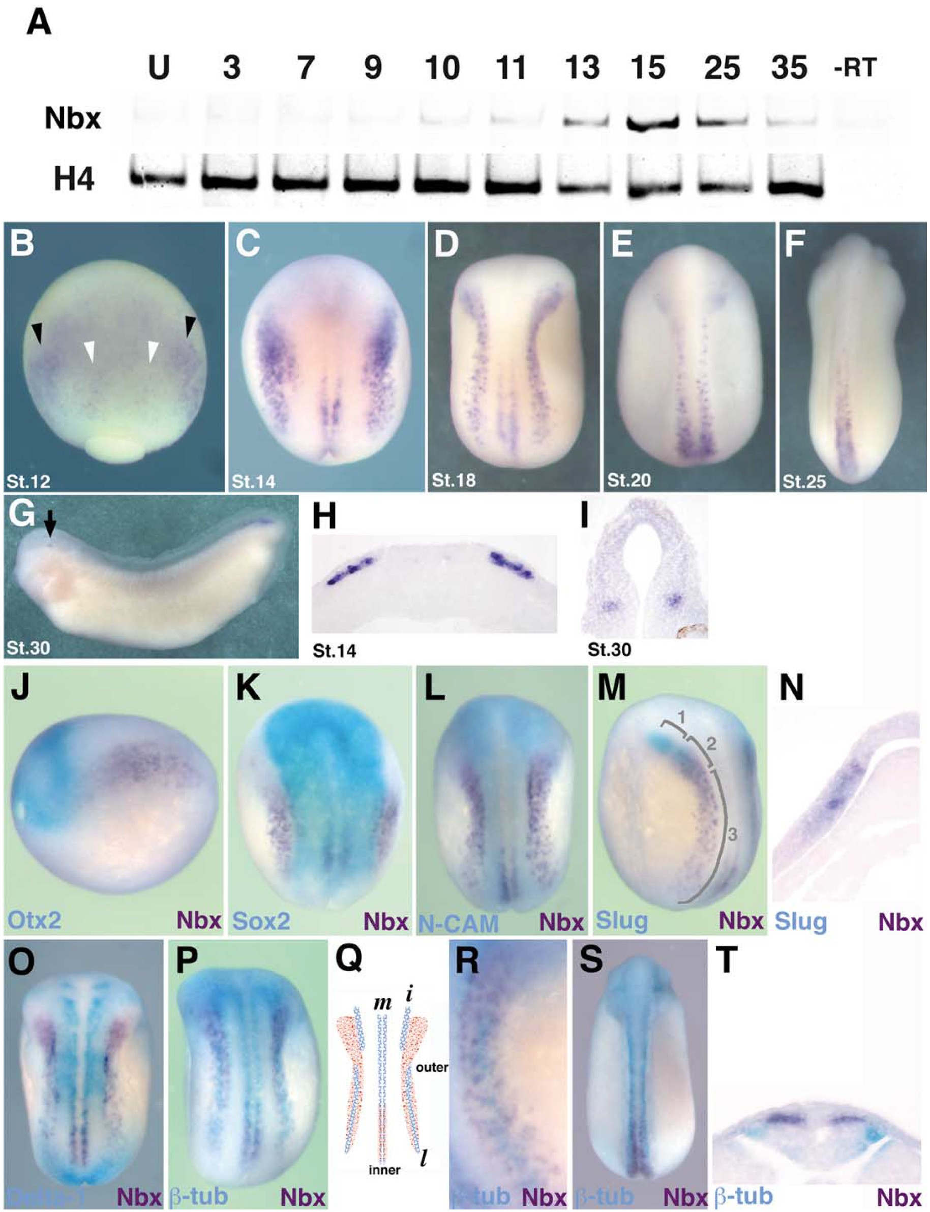 Fig. 2. Temporal and spatial expression of Nbx during Xenopus development. (A) Temporal expression patterns of Nbx. RNA was extracted from embryos at the indicated stage of development. Nbx mRNA expression levels were measured by RT-PCR. The ubiquitous marker histone H4 served as a control. (B�I) Spatial expression patterns of Nbx. Nbx expression was analyzed by whole-mount in situ hybridization. (B) Stage 12. Black arrowheads in (B) indicate outer stripes, and white arrowheads indicate inner stripes of Nbx expression. (C) Stage 14. (D) Stage 18. (E) Stage 20. (F) Stage 25. (G) Stage 30. Arrow in (G) indicates new expression of Nbx in mesencephalon, and a transverse section of this region is shown in (I). (H) A transverse section showing the outer stripes at stage 14. (I) A transverse section of Nbx-expressing region in mesencephalon at Stage 30. (J�T) Comparison between recognized markers and Nbx expression. Whole-mount double in situ hybridizations were performed with a digoxigenin-labeled Nbx probe and a fluorescein-labeled probe for another marker. (J) Nbx (purple) and Otx2 (blue) at stage 14. (K) Nbx (purple) and Sox2 (blue) at stage 14. (L) Nbx (purple) and N-CAM (blue) at stage 16. (M, N) Nbx (purple) and Slug (blue) at stage 16. The 1 in (M) indicates the region where only Slug was expressed; the 2 indicates where Slug and Nbx were coexpressed (a transverse section of this region is shown in N); and the 3 indicates where only Nbx was expressed. (O) Nbx (purple) and Delta-1 (blue) at stage 16. (P) Nbx (purple) and -tubulin (blue) at stage 16. (Q) A schematic representation of the expression of Nbx and -tubulin. (R) An enlarged view of the outer stripe region at stage 16. Nbx (purple) and -tubulin (blue). (S, T) Nbx (purple) and - tubulin at stage 25. The transverse section of posterior region is shown in (T).