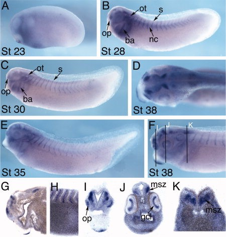 Figure 2. Spatial expression pattern of snca. snca becomes detectable in the brain from the tail bud stages. A�C, E, F: Lateral view. D: Dorsal view. G, H: Longitudinal sections of a stage-38 embryo. I�K: Transverse sections of a stage-38 embryo at the levels illustrated by black lines in F. ba, branchial arch; gcl, retinal ganglion cell layer; msz, marginal and subventricular zones of the midbrain and neural tube; nc, notochord; op, olfactory placode; ot, otic vesicle; s, somite.