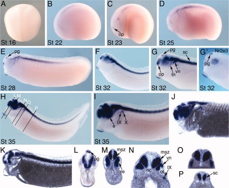 Figure 3. Expression of sncbb. No expression of sncbb is detected before the tail bud stages. A: Dorsal view of stage-18 embryos. sncbb is mainly expressed in brain and spinal cord at the tail bud and tadpole stages. B-I: Lateral view of tail bud- and tadpole-stage embryos with anterior toward the left. G′: Expression of Nr2e3 in the pineal gland and retina of a stage-32 embryo. J, K: Longitudinal sections of a stage-35 embryo. L-P: Transverse sections of a stage-35 embryo at the levels illustrated with black lines in H. e, eye; IX, cranial nerve IX; msz, marginal and subventricular zones of the midbrain and neural tube; nc, notochord; op, olfactory placode; ot, otic vesicle; pg, pineal gland; re, retina; sc, spinal cord; tn, trigeminal nerve; vn, vestibulocochlear nerve; X, cranial nerve X.