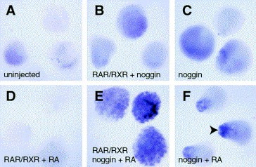 Fig. 6. Retinoid signalling promotes the formation of primary neurons in neuralized animal caps. Animal caps were taken from control and experimental embryos injected with either noggin or RAR/RXR mRNA or a combination of these RNAs and grown from the late blastula stage in the presence or absence of 10â7 M RA. The animal caps were assayed at the equivalent of the late neurula stage for the expression of the primary neuron marker, NST. Widespread punctate expression of NST was seen only in animal caps injected with noggin and RAR/RXR mRNA and treated with RA (E). Both non-neuralized animal caps with elevated retinoid signalling (D) and neuralized animal caps with RAR/RXR but no ligand showed no NST expression. The addition of RA to noggin-neuralized animal caps (F) consistently showed a small amount of NST expression clustered to one end of the animal cap (arrowhead). This may reflect the observation that animal caps are heterogeneous and respond to neural induction more strongly on the dorsal side (Sharpe et al., 1987). Image published in: Sharpe C and Goldstone K (2000) Copyright © 2000. Image reproduced with permission of the Publisher, Elsevier B. V. Larger Image Printer Friendly View |