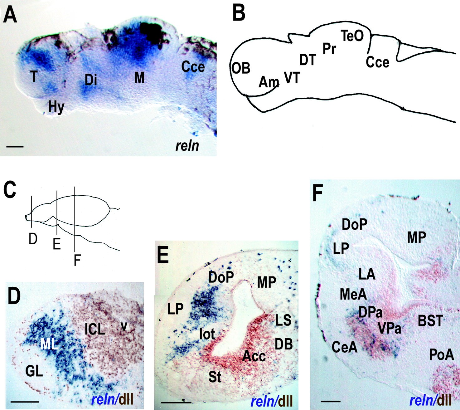 Figure 9. Reelin expression in the brain of developing Xenopus laevis. A,B:reelin (reln) expression (A) and schematic drawing (B) of stage 35 Xenopus embryo. C: Schematic drawing of a stage 50 Xenopus brain, illustrating the position of sections in D–F. D–F: Frozen transverse sections showing gene and/or protein expression (indicated bottom right). Dorsal is to the top. D: Accessory olfactory bulb. E: Rostral telencephalon. F: Caudal telencephalon. For abbreviations , see list. Scale bars = 100 μm in A, D–F.