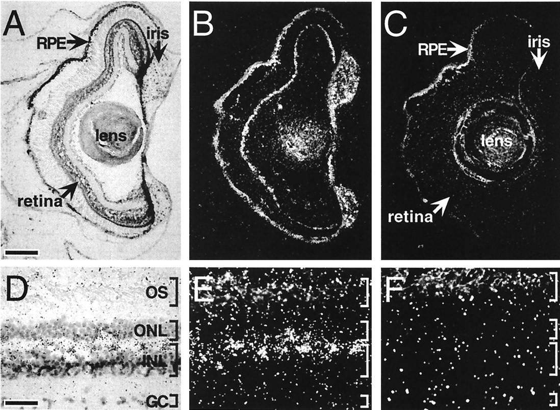 Figure 5 Bright-field and dark-field photomicrographs of melanopsin transcript distribution within ocular structures. In sections of tadpole (stages 56 and 57) (A and B) and adult (D and E) eye, melanopsin transcripts were identified in retinal cells within the outer lamina of the inner nuclear layer (INL) (A, B, D, and E). In contrast, incubation of adjacent sections with the sense RNA probe (C and F) resulted in no labeling above background. (Corresponding bright-field views are not shown.) Intense cell-specific hybridization was also observed in the iris and less intensely within the RPE. GC, ganglion cell layer; ONL, outer nuclear layer; OS, photoreceptor outer segments. [Bars = 150 μm (A) and 35 μm (D).]