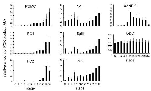 Differential onset of expression of mRNAs encoding proopiomelanocortin, prohormone convertases 1 and 2, and granin family members during Xenopus laevis development. , Holling TM, van Herp F, Durston AJ , Martens GJ., Brain Res Mol Brain Res. January 10, 2000; 75 (1): 70-5.